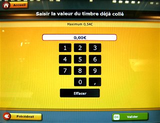 It is possible to obtain ATMs with the minimum value programmed into the postal kiosk (usually 0.01 EUR), from the 20 different types currently programmed, and with the special text 'COMPLEMENT D'AFFRANCHISSEMENT'. Simply select the shipment type and indicate a previous franking 1 cent less than the corresponding postage rate.