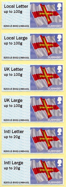 The Guernsey Post philatelic department also sold sets with the six postage rates programmed, or 'Collectors strips', with the 'Guernsey flag' design and the same special imprint, but issued by the internal usage printer B002. |