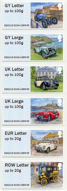 The Guernsey Philatelic Bureau also sells six-value sets or 'Collectors strips' with the 'Guernsey flag' design and the Spring Stampex 2019 commemorative imprint and the new 'Old Car Club' thematic series. These are all issued in Guernsey with the DKU system, with the GG04 special code.