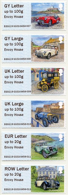 The new '50th Anniversary of the Guernsey Old Car Club' series was available, from February 13th 2019, at the GG01 philatelic kiosk temporarily installed at Spring Stampex 2019 and from the permanent GG02 kiosk installed at Envoy House, Saint Peter Port, Guernsey; in this latter case, with the ' Envoy House ' imprint.