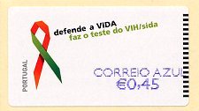 | The 2 new self-adhesive labels, one smaller design to be used in the ATM vending machines Amiel, SMD and NewVision Epost, and another large size for the Crouzet machines, have a similar design to the Vasco Marques, with a red ribbon on the left and the text 'defende a VIDA, faz o teste do VIH/SIDA' (Protect the life, take the HIV/AIDS test). |