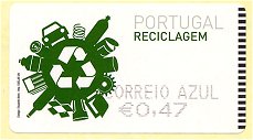As usual, rolls of self-adhesive labels were manufactured in 2 different sizes: 55 x 30 mm. to be used in Amiel, SMD and NewVision Epost vending machines, and size 80 x 30 mm. for the Crouzet distributors. The design is identical for both sizes and is based on the universal recycling logo. The designer is the Portuguese Eduardo Aires, a graphic arts doctor who is also the designer of other stamps issued by Correios de Portugal. |
