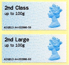 The second roll ('Reel B') issued ATMs of the new Machin design for 2nd class stamps, in the only two programmed postal tariffs for domestic mail (2nd Class and 2nd Large). This design was introduced and used for the first and only time during the Spring Stampex 2013 (see article > , and also VARIABLE 28), because the special equipment required for their issue has still not been installed in any post office. |