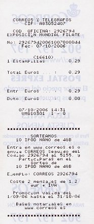 Este equipo estuvo emitiendo estampillas del modelo España 06 hasta el lunes 9 de octubre a las 11 de la mañana. A esa hora se decidió sustituir el rollo de estampillas para que todas las emisiones de España 06 se realizaran tan sólo desde las oficinas temporales de la Exposición y, como ya viene siendo -desgraciadamente- habitual, prevenir los abusos de algunos coleccionistas que, ante la negativa de emisión de ATMs de 0,01 EUR en la Exposición, se desviaban hacia la Oficina Principal con más o menos importantes pedidos.