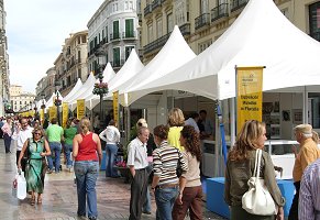 | Cruzando la Alameda, en la céntrica calle Marqués de Larios, el auténtico corazón comercial de la ciudad, se había instalado un pabellón con una exposición de diferentes objetos cedidos por algunos de los personajes que protagonizan las emisiones de hojas-bloque de España 06, así como la feria comercial, con 34 puestos de comerciantes y 10 de administraciones postales, que se alargó hasta el día 15. |