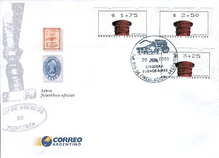 Derecha, sobre de primer día de emisión franqueado con un ATM de valor $0,75 |