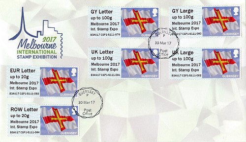 During the four days of Melbourne 2017, the CSP1 kiosk issued Jersey Post stamps with the thematic series 'The Crest of Jersey' (in matt finish) from one of the reels, and Guernsey Post stamps with the 'Guernsey flag' definitive design from the other reel. Each postal administration had its own programmed face value indicators, but all the stamps included the special imprint